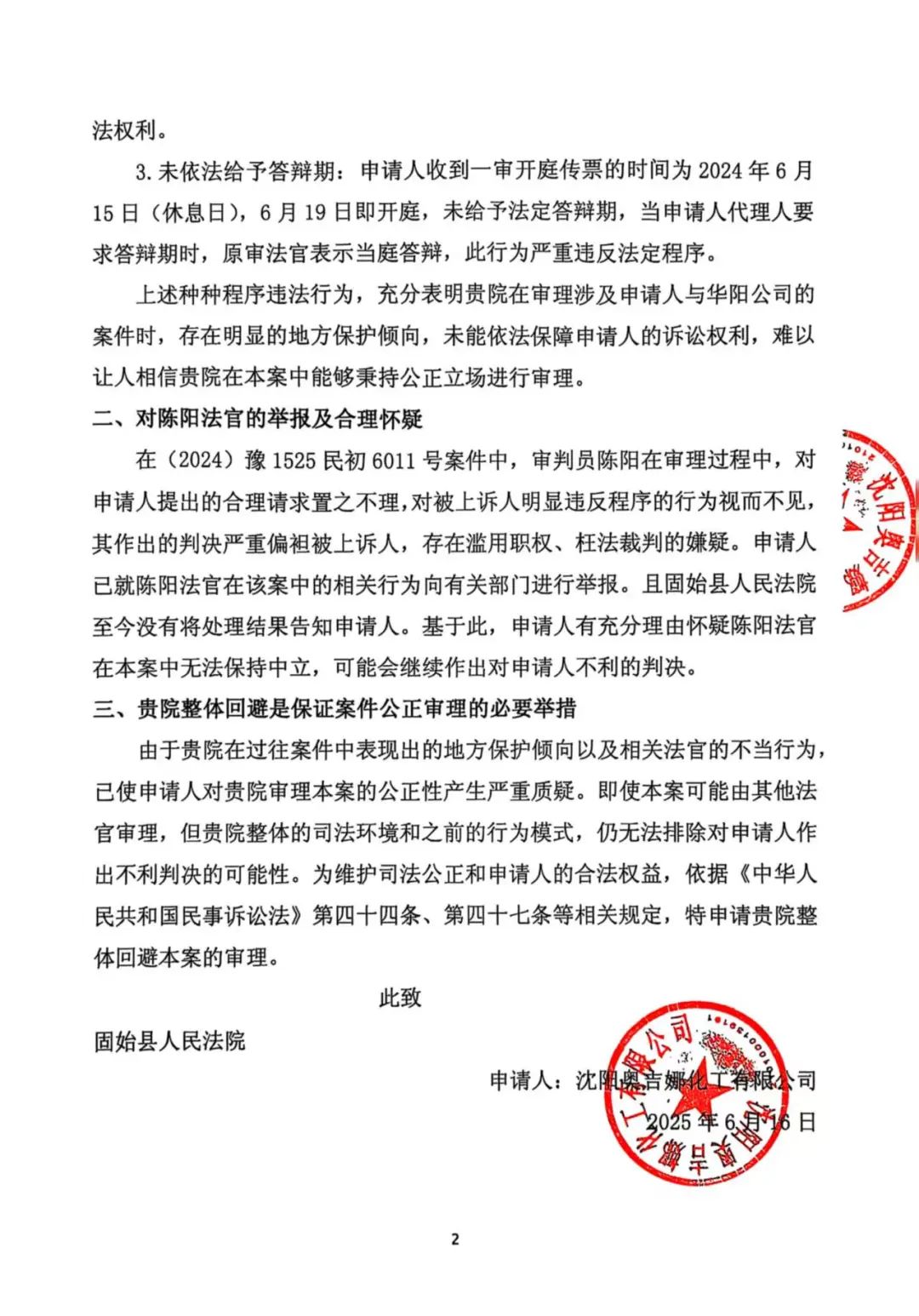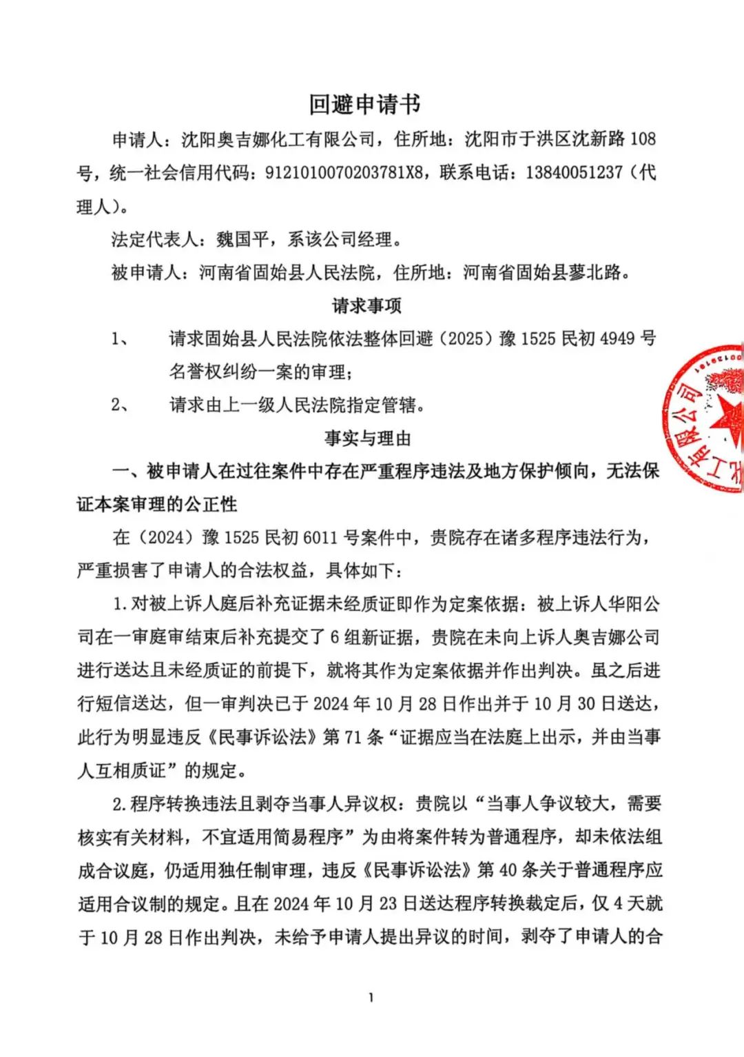 基于固始縣法院在原一審判決中存在嚴(yán)重違法行為及地方保護傾向,且奧吉娜公司已就原一審法官陳陽在該案中的相關(guān)違法行為向固始縣法院等有關(guān)部門進行舉報,但固始縣法院至今沒有將處理結(jié)果告知奧吉娜公司,奧吉娜公司認(rèn)為固始縣法院無法保證該案在重新審理中的公正性,可能會繼續(xù)作出對奧吉娜公司不利的判決,奧吉娜公司于2025年6月16日依法向固始縣法院寄遞《回避申請書》,請求固始縣法院依法整體回避該案審理!(下附《回避申請書》、案由和案件過程簡述)