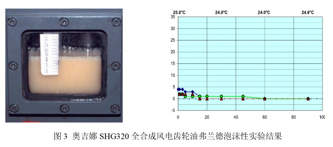 依據(jù)Flender(弗蘭德)泡沫性試驗(yàn)GG-V425的試驗(yàn)要求,對(duì)奧吉娜全合成風(fēng)電齒輪油SHG320進(jìn)行了泡沫性評(píng)價(jià)(實(shí)驗(yàn)結(jié)果見圖3),在整個(gè)實(shí)驗(yàn)過(guò)程中,形成的泡沫量不到5%,遠(yuǎn)遠(yuǎn)小于Flender試驗(yàn)要求的15%,抗泡沫性能優(yōu)越。同時(shí)消泡劑的特殊結(jié)構(gòu)也減少了過(guò)濾設(shè)備對(duì)它的吸附,使得使用過(guò)程中損耗減小,完全滿足了風(fēng)電齒輪油長(zhǎng)壽命的要求。