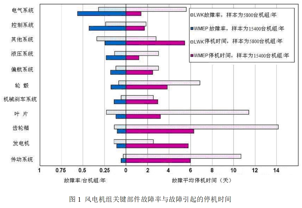 據(jù)風(fēng)電機(jī)組主要零部件可靠性研究表明,在風(fēng)電機(jī)組的故障中電氣和控制系統(tǒng)故障率最高,齒輪箱故障率相對較低,但通過進(jìn)一步統(tǒng)計顯示,電氣和控制系統(tǒng)的故障容易排除,停機(jī)時間短,而齒輪箱引起的故障難以排除,費用大并造成長時間停機(jī),最長達(dá)到半月之久(詳見圖 1)。