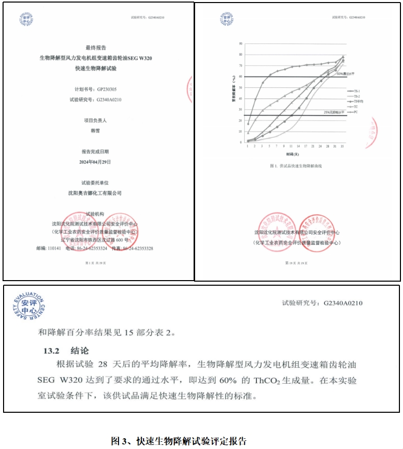 奧吉娜生物降解型風力發電機組變速箱齒輪油SEG W320產品已順利通過快速生物降解試驗的評定,該產品的生物累積降解率高達75.1%,完全滿足快速生物降解性的標準(見圖3)。
